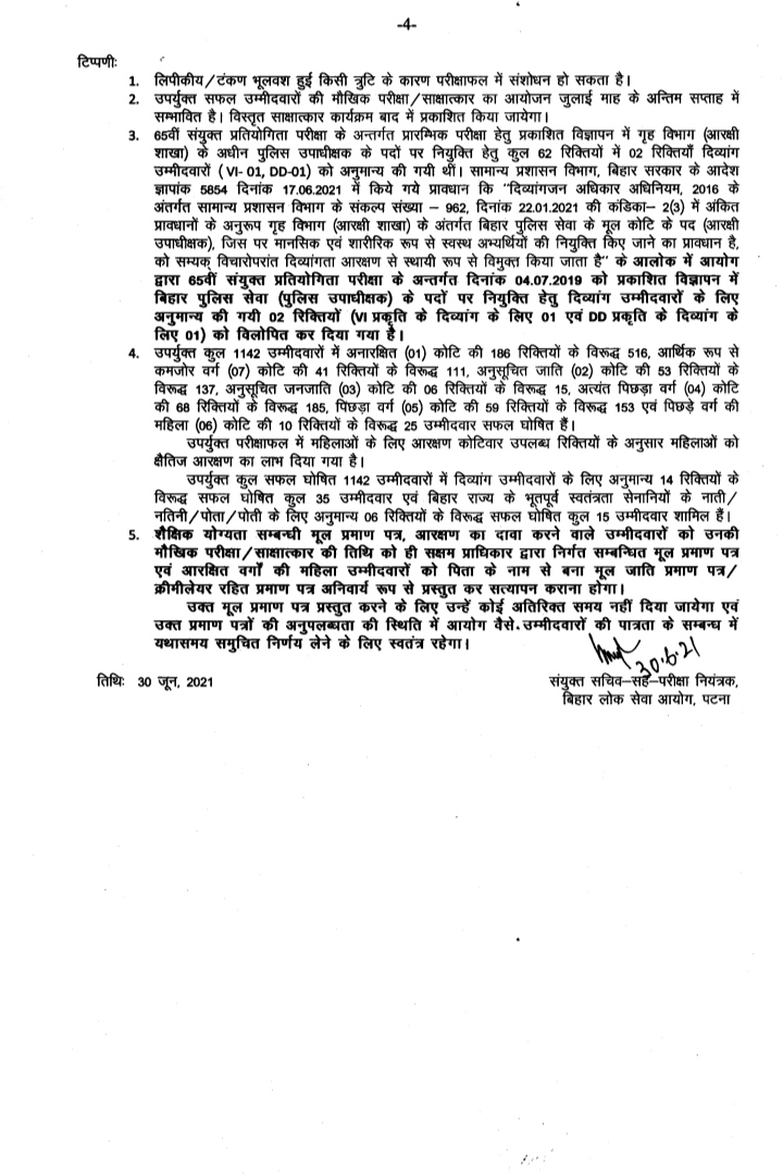 Bihar public Service Commission के द्वारा जारी किया गया 65वी मुख्य परीक्षा का रिजल्ट :-